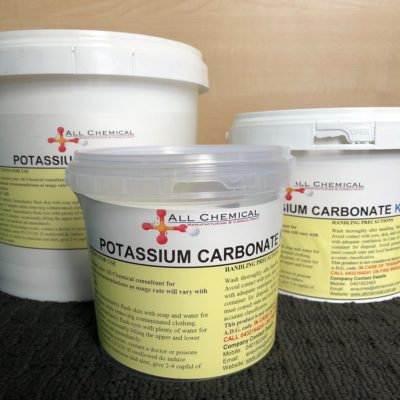 Potassium carbonate (K2CO3) is a white salt, which is soluble in water (insoluble in ethanol) and forms a strongly alkaline solution. It can be made as the product of potassium hydroxide’s absorbent reaction with carbon dioxide. It is deliquescent, often appearing a damp or wet solid. Potassium carbonate is used in the production of soap and glass